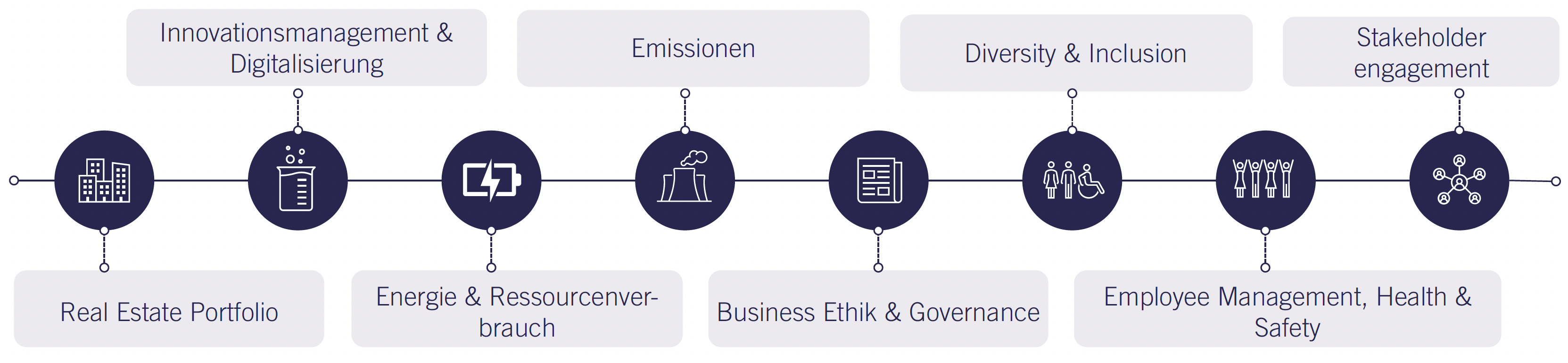 die vier Kategorien Wirtschaft, Umwelt, Soziales und Governance eingeteilt. Innerhalb dieser Kategorien wurden materielle Themen identifiziert, welche nachstehend beleuchtet werden. Mit einer zukunftsgerichteten Nachhaltigkeitsmission sollen diese materiellen Themen in den kommenden Jahren ausgebaut und weiterentwickelt werden. In diesem Zusammenhang sollen in den kommenden Jahren zusätzliche Plattformen geschaffen werden, um mit den Stakeholdern weiter in den Dialog zu treten und somit eine langfristige und transparente Beziehung zu fördern.